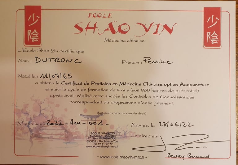 2022 - Diplôme d'Acupuncture - Ecole SHAO YIN